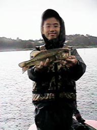 私はラバジ、センコー、4インチグラブのテキサスで探るもセンコーで1度バイトがあったのみ。操船して先行する近藤さんが、そこ、あそこと討ち残しを作って場所を教えてくれるが、なかなかこない。そこで牛久で実績のある黒のゲーリージャンボグラブを分けてもらいテキサスリグをシンカー固定にして挑戦。そしてやっときました、かわいいが牛久の初バス。近藤さんはめったに釣らない30未満のバス。根つきのバスは黒い? 確かに模様が黒々とはっきりしている。だんだんアシ討ちの要領がわかって来てパラアシで2匹目やっと30Cm。サイズアップを狙うも昼過ぎ。一度上がると桟橋が一部水没しており水位が急激に上がっている様子。休憩後もう1度ボートを出したが反応なしで、風もおさまらないので本日終了。