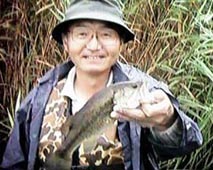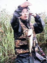 アシ原と言っても、アシ、マコモ、ガマ・・・といろいろある。アシの隙間や、密集したアシの根元がエグレた状態の所が狙い目。ガマはあまり魚が居着いておらず根がかり(葉がかり?)すると外れ難い。近藤さんのお好みはマコモ。そこで、得意のウェッピング。7ftのロッドでアシ奥の隙間にジャンボグラブを落とし込む・・・ポチャン、ジャバッ、バシッ!で、デカバスを取り込む。”男らしい釣り”とはこの事か! 「43Cm、ん〜、でも重さが・・・」と不満顔。トーナメントではサイズより重さが勝負とのこと。牛久のバスはでかい!