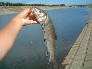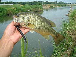 先週は権現堂でニゴイがやっとだったので、今週は中川を本格的に狙ってみる。しかし今日は娘の部屋にクーラーを設置に来るので遠出はできない。そこで8時から一番近い中川新幹線下へ・・・ しかし、センコーやダウンショットにさえこない。次は用水路合流地点でここは1999年にバドで44Cmを釣った所。早速B.B.プルトップを試してみるがサイズが小さいので流れのある川ではおとなし過ぎる。そしてスピナベのバジングを川でも試してみる。流れを巧く使うと浮き易く感じは良い。たまのチャリ〜ンはアピール度もある。しかし出遅れの8時過ぎでは活性が低い・・・ となるとやはりセンコーです。4”黒を流れの巻き戻りに乗せてふんわりさせていると根がかり風のあたり! 泳ぎだすと川バスは引く引く、そして43Cmがあがってきました!今年4本目の40UPです。やっぱりバスは40以上ですね〜