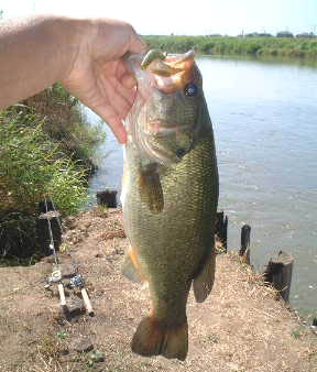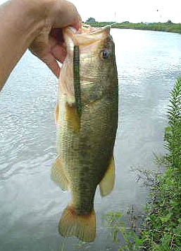 しからば新幹線下流の小水門へ! このあたりの護岸は石積み風に工事され、3〜4m先でもう一段落ちている。そこにバスがひそんでいることが多いのです。で、まず来たのが26Cmのコバッチ君!(左) 次を狙って藪こぎして少し上流へ移動。センコー流しを少し早く巻き上げていると、ゴン!と来ました。うむ、久々の立派な川バス42Cm(右)でした。