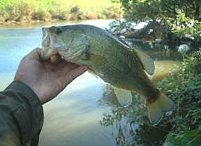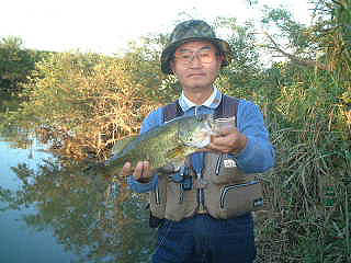 次は五霞へ移動、本流はだめで11時過ぎに放水路へ入る。並んでいるへら師も釣れてないとのことで、ならば秋パターンのプラグBOMBERロングAミノーのおでまし。針が3つ付いているでかいUSA物です。遠投し早巻き底狙いで3投目・・・ゴン!放水路の中央付近でひったくるようなあたり。Abuのドラグが出る。巻く。潜る。フッキングを2〜3回入れて確実に針を通す。水面で空気を吸わす。そしてへら師の皆さまの前で45Cm(写真左)をハンドランディング。陽気なおじさん「デカイね。写真撮らねば!・・・」最近はへら師の皆さまもバサーに理解があるようです。やっと3本リミットメイク32+34+45=111Cm。う〜む、40UPがもう少し欲しい・・・ と4号線下まで試すも釣れず。帰ろうとして放水路を戻るとよっしーさんに遭遇!しばし立話して午前の部終了。