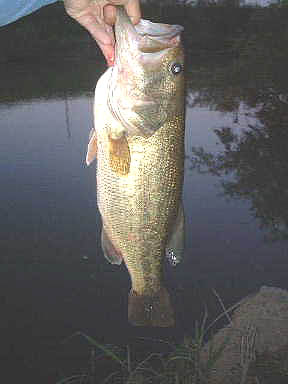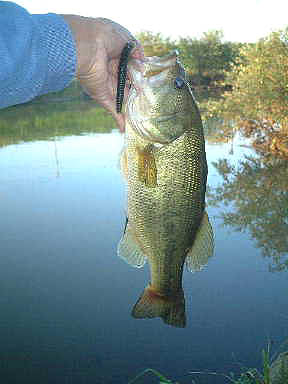 そして五霞放水路への移動も考えたが12時間タイムアップの6時まであと1時間しかないので、ここでねばることにする。数カ所のポイントをローテーションして場を静めながらデカバスをセンコーで狙う。また、まづめのトップ狙いでジタバグでボコボコ誘うも出ない。 そして5時45分、センコーの落とし込みにいつにないあたりと引き!!ここでやる時はプッシュに巻かれないように、速攻引き離しのためドラグは固定してある!巻く。引く。跳ねる。出てきた。沖に潜る。重い! ドラグ固定のため竿と腰でテンション調整。寄せる。エラ洗い。デカイ。やっとハンドランディングしたのは47Cm(写真左下)でずっしり。自己記録を更新です! いや〜ねばった甲斐があった!