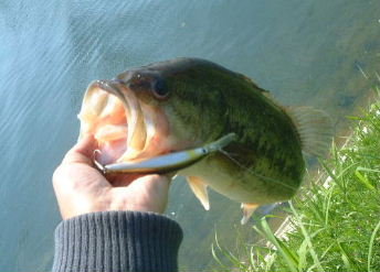 だから何があってもネスト付近を離れない。別の魚が近づくとチェイスして威嚇します。その速さは駿足です。ますスミスウィックのサスペンドミノーでそーとのぞいてみるとバスは魚とルアーを確実に見分けてます。これはバス君の性格にもよりますが直ぐに威嚇バイトするバスも居れば慎重なバスもいます。今日の慎重バス君はラトル音を出すと一度は逃げて知らんぷりします。まるでヒバリが巣の遠くに降りておとりになるのに似てます。そのうちプラスチックのルアーを見切り逃げなくなります。で、次はラバージグ、近くに落とすと関心を示して寄ってきます。モゾモゾ動かすとジリジリ寄ってきてそっとつつきます。でもバイトに至らない・・・ そこで3"リーバーをトレーラーとして付けて見ます(大きいケイテックのトレーラーなんかはフン!です)尻尾をそっとかじりますが、針までのバイトには至らない。次はスティックベイトのフォーリングですがフォーリングには無反応、着底したバレットを体を横にしてつつきますが食いづらそうでバイトには至らない。では食いやすいリーバ4”でダウンショット・・・寄ってくるがバイトしない。しからばワッキーのダウンショント・・・? 約90分が経過しコバスが寄ってくると激しく追って威嚇すること2回、そろそろバスのチェイス本能にスイッチが入ったかと思い同じ位の大きさのシュガーDeepSuspendミノー90を送り込み、動きからネストと思われる真上にスティ・・・ さすがの慎重バス君もこれにはスイッチオンしたらしくリアフックをバイト!上がってきたバス君の迷惑そうな顔!ゴメン2時間も遊んでくれてありがとう・・・ 早めに戻せばものとネストに戻ります(人間の勝手な言い訳か?・・・)