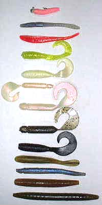 写真は上からバブルガムピンクのジグヘッド、サワムラのリッジ3”、ロボワームのアライブシャッド3”、バスプロショップのトリプルリップルグラブ、ラッキーストライクの3"グラブパール、エコギアのパワーワーム3"グラブ、4 1/2夜光、〃スモーク、ゲーリーの4"グラブ黒、クロステイルシャッド、エコギアストレートワーム、ヤマセンコー3”、サワムラバレット4”(参考)