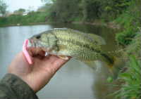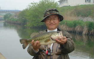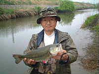 翌20日は「朝50UPが出ました!」とのBBS情報に、雨にもめげずお出かけ。まずは権現堂へ行って岸辺をさぐるが、どこもバスは岸に寄っていない。ヘラも釣れないとのことで、今年の権現堂は例年と比べても何か変です。そこで夕方中川某所へ行って見ると、久しぶりにtake1049さんに会いました。 そして4号線の奥でヤマセンで44Cmが釣れて、職業:釣り師?さんに写真(右)を撮ってもらいました。これで今年は40UPのみ6本!?