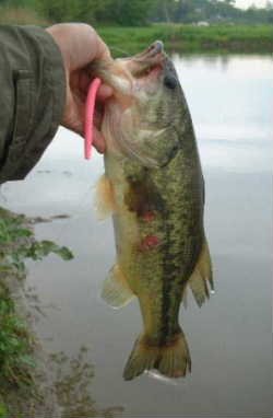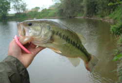 でもハイプレッシャの池はなかなか釣れない。12時も過ぎてmanzohさんと分かれたが、私は何としてもここで1本欲しいのでねばる。manzohさんが釣ったあたりでヤマセン3”バブルガムに変えてフィネッスに誘う。するとバイトがあり23Cmのかわいいバスくん(写真左上)が釣れました。そしてすぐに同じところで37Cm(写真右上)が食ってきました。