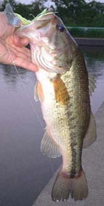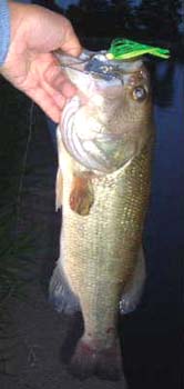 ここは完全護岸の小さな遊水池で水はあまり綺麗ではない。へら鮒や鯉は居るがバスは未確認でした。1周バズベでチェックしたが出ない。2周目も終わって帰ろうとした6時半過ぎ、岸際をノーマルなバズベイトで護岸に食い込むように引いているとジュボツとでました!バラしてなるものかと岸を移動しながら確実にフッキングさせ、ラインを持って引きあげるとやせてはいるが42Cm(写真左)ありました。やっぱりいるんだ!今ではバスはどこにでもいる。裏の川にも、ちょっとした遊水池にも!だからバスにも市民権を!(少し脱線・・・)次はサイズアップを狙ってアイアンバズに交換。これはブレイドが2重になっており引いても曲がらない。そしてハデなライムチャートのスカートを履いている。昨年中川で49の実績ありです。そして岸際へ投げて真っ直ぐ引くとガボッツと出ました。ウ〜ム、7時過ぎはゴールデンタイムだ! これはでかそう・・・と、慎重にやりとりして、いなして引き上げると45Cm(写真右)ありました。アフタースポーンバスかスリムでしたが、45UPは最後までゴンゴンと潜ろうとします。だからバスフィシングはやめられませんネ!