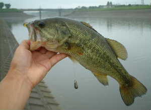 そして夕方は雨にもめげず中川の五霞水門下流付近へ久しぶりに行ってみました。雨続きで水量は十分。6時過ぎ、流れがぶつかり分かれるあたりへセンコーを流すとガバッときてくれました。お久しぶりのバスくんは37Cmで40には届かなかったがウレシイ! そしてこの辺で良く会う74かとうさんが写真を撮ってくれました。(写真右)これからは中川の本流が釣れそうです。でも、雨の日の増水には充分注意して下さいネ!