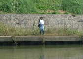 別れて私は下流の石積み護岸の1段深くなっている所を狙う。