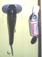 入って中川は減水し渋くなってきました。先週は万年さんが中川仲間の注文品を持って来てくれたので私も行きました。4ブレードドラゴン?スピナベやマルチブレード即浮き万バズなど名品を拝見。たじまんさんのはmanzohさんがあずかったしチョコボさんも来たし・・・ 私は万ちゃん改造のダメ化計画、迷走へのお誘いバージョン?13Cmジタバグ風ナマズ(写真左)を託されこれで50UPを釣る課題ができました。夏なら一発で釣れそうな良い動きをするが・・・