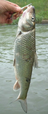 写真は「バジル」のニゴイ45Cm!(写真はリアフックにバイトしフロントフックがエラに絡んでいる状態) バジルは細身でもウエイトとシェイプのバランスが良いので川の流れのなかでもしっかり泳ぎバイトを誘うのでしょう。この他にバジルで41と39、そしてVISIONで40でした。 ニゴイは川の流れの中では追い食いしてるのか、ほとんどがリアフックにバイトしてます。泳ぐスピードが早いので引きもなかなかの味わいでした。