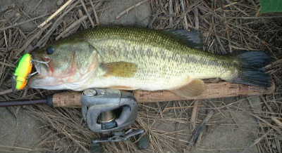 42Cmにサイズアップしました。 今朝は町内会の道路掃除が六時半からあったのでその前にトップ狙いで行ってみました。するとバドにバイトがあり反射的にフッキングしたら12ポンドのフロロがブチッと切れちゃいました!? キズがあったのか結びが甘かったのか?・・・ トップのフッキングは向こう合わせで十分なのに、目の前でガバッとバイトしたので反射的に電撃フッキング・・・ハードなタックルでは禁物ですネ