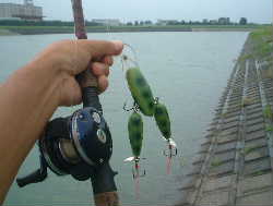 夏場は増水に備えて水を抜いているリザバー権現堂へお出かけ。 アオコも薄まり結構良い感じ! 投げ始めは先日のオフ会でネンちゃん提供のデカイかえる!?(写真左) 実はこれ「リバーシブル」だったのです!? 投げるたびにひっくり返るので「ひっくりカエル1/2」とネーミングしたのですが、投げ続けてみると、ひっくり返った状態は見事に完全トップのスイッシャーになるのです。しかもパラレルWスイッシャー! 正常の時はクランク並にもぐりゆらゆらと誘う・・・ これで釣れない訳はない・・・と迷走状態に入ったプラグは数多い!・・・?