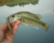 15夜の大潮だというのに、早朝からあちこち試すも釣れない・・・午後はバスがついていれば大きい落としの合流ポイントへ行き、デスアダーを投げる。・・・と、コン!とバイトしました。 そしてやっとサイズアップして39Cmが釣れました! 40には届かないが、うれしっ!