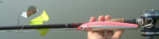 でも、先日の玉バスオフ会で万ちゃんから「今年のお題」としてもらった万バズマグナム??のようなデカイのも投げてます。しかしこれはパーツのバランスがいま一つで投げるとひっくり返ります・・・。 前にねんちゃんからもらった「ひっくりカエル」と同じ系統で、しかも引くと片肺でも水中と水上で回りながら風車します。どうしょうか? メタルジグでも付けて重くしてみる〜?