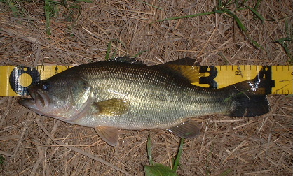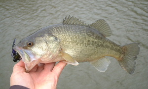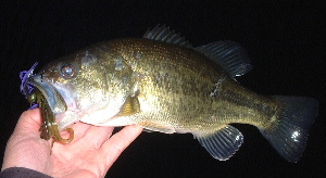 で、あきらめての帰りの6時過ぎ、岸際にラバジを落とすと・・・おっ食った! エイッと抜きあげると34Cmのバスくんが食らいついてました。 そして、まだいるかな〜と投げると・・・おっ今度は30Cmが食らいついてきました。 そしてまだいるかな〜 で29Cmと、サイズはともかく3匹も釣れちゃいました。 私としてはシーズン中みたいな一気爆釣!? 先週言ってた「普通サイズも動き出した」・・・の通りになりました。