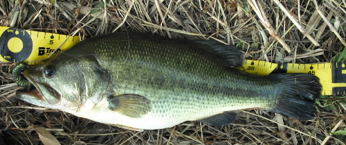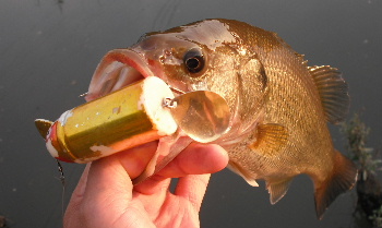 あちこち廻って12時半頃でしたが、杭まわりでボジョっと出て乗りました。39Cm、950gでしたが真昼間にトップで釣れるとウレシイもんです!! で、今日もこれ1本でおしまい。