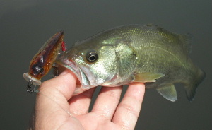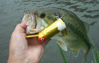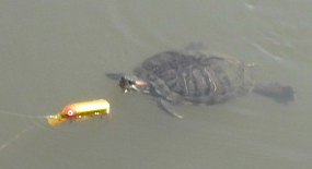 そのポッパーの早引きに飛びついてきた魚があり(写真右)、バスでした! 22Cmとコバッチですがポッパーに出るとは偉い! ・・・てなことで、今週もトップで釣れました!?(いっそ亀をトップで釣りたかったが?)