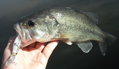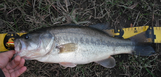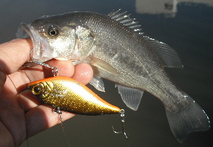 そして4時過ぎに岸際でバイブレーションに何か食った!! で、あがってきたのは40Cm丁度、1Kgのバスくんでした。 リアフックへのバイトでしたからやはり追い食いでしょうか。 この季節キンクロのバイブレーションは強いのです。
