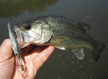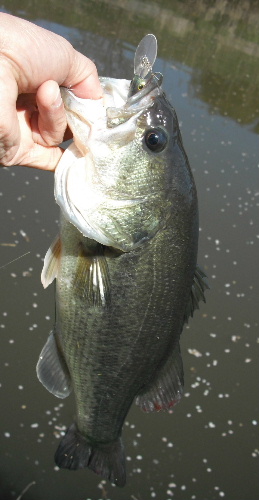 ミノーやシャッドをあれこれ投げるも釣れない。 で、頼りはエバグリのスーパースレッジ。 食った! 昨日のバラシにならないように慎重に寄せてみると、がっつり呑み込んでいる。ならばエイッと抜きあげると38ありました。(写真左)今日のバス君は食い気十分でした。