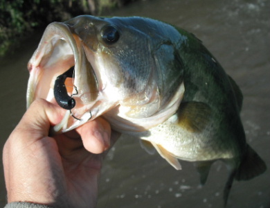 夕方やっと釣れました。 まずは朝の報告からですが、トップの良く出るポイントでエスマウス、エスバグ、金バドを投げるが何れも出ず。念のため投げた4”グラブで写真左の44Cmが釣れました。ルアーの世界では「小は大を兼ねる」「トップよりはボトム」なのです。