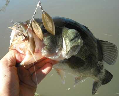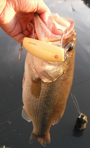 夕方、去年トップで良い思いをしたところへ行き「エスマウス」を投げる。2投目で「モコッ」とバイト! ブッシュに巻かれないように速攻で巻きあげ、寄せてみるとしっかりフッキングしている。42Cm、1.3Kありました。