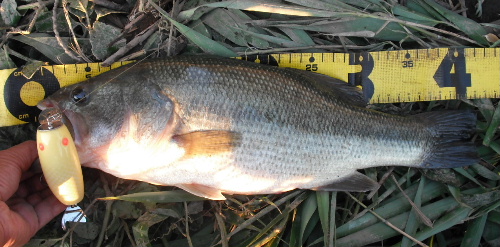 場所を移動してトッププラグをローテーションして投げるが出ない。 ふと先日の「スピナベのバラシ病」を思い出し、リベンジ!と思って投げると38Cmが釣れました。対策は「スナップを使わず直結びすること」で、今回はしっかりランディングできました。